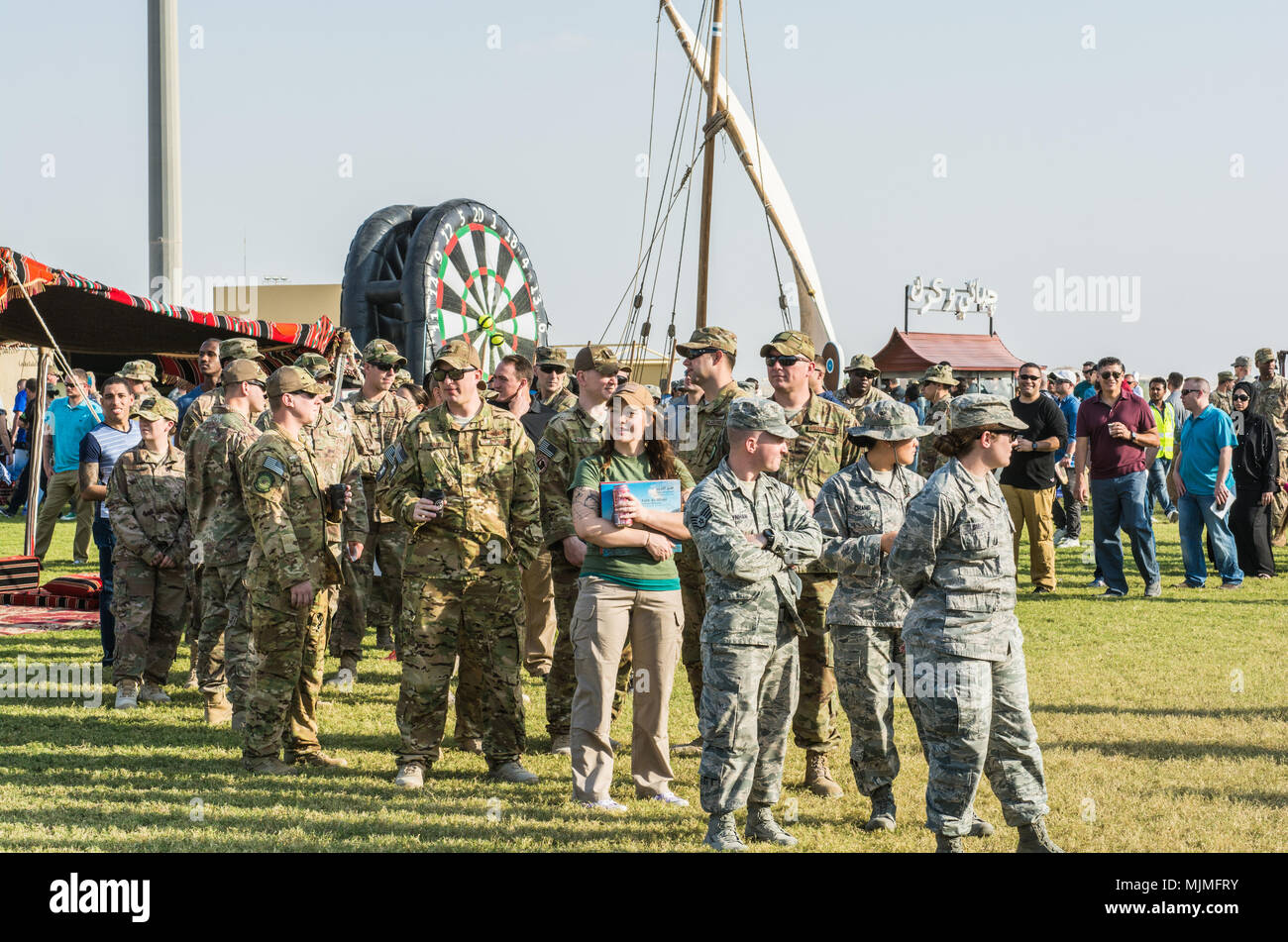 U S Services Members And Coalition Partners Stand In Line For A Gift Bag At The Qatar